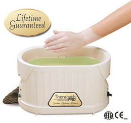 - Therabath PRO Paraffin Bath. Hospital grade paraffin warmer with lid, grille, and paraffin therapy guide. Includes 6 lbs. of triple-filtered paraffin. This portable paraffin bath will help relieve pain in joints and stiffness in muscles, increase range of motion, and stimulate circulation. Thermostatic control keeps the paraffin at the optimum temperature for maximum therapeutic benefit. Wax is heated to a temperature between 126 and 130 degrees F. You can apply melted paraffin to affected area by dipping or by brushing on. Accommodates hands, feet, and elbows yet is small enough to fit on a countertop. Unsurpassed lifetime guarantee.