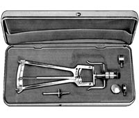 Schiotz Tonometer, Sklar Original. Screw-on 5.5 gr. weight. 2 additional weights: 7.5, 10 gr. Test block. Fitted tonometer case. Certified.
