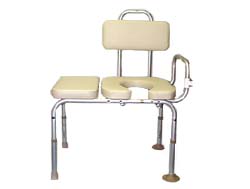 - Transfer benches allow the user to sit down on the edge of the bench, swing their legs over into the tub, and then slide across the seat of the bench into the tub. Two legs of the transfer bench go into the tub while the other end of the bench remains outside of the tub. Standard Padded Transfer Bench. A commode opening affords the user greater comfort and better access for cleaning. Thick, high density foam cushions and backrest for comfortable seating that won't bottom out. Suction cup footpieces secure the bench to tub floor. Lightweight, anodized aluminum frame is height adjustable in 1/2" increments. Side arm and seat handle provide extra stability and leverage when transferring. Weight capacity 300 lbs.