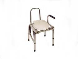 - The Guardian Drop Arm Commode is designed for patients that have difficulty in rising to a standing position and must slide from the wheelchair seat onto the commode seat when transferring to a bedside commode. The arms of this commode are designed to drop with just a push of a button. With the arm out of the way, leg movement is unrestricted and allows for an easy transfer to or from the commode. The chrome plated steel frame is rust resistant and durable. The foam handgrips provide a secure grip, even if wet. Backrest can be removed for use as a toilet safety frame. A pail with lid and a splashguard are included. The drop arm commode weighs 26 lbs. and will support a user up to 300 lbs. Seat height is adjustable from 18.5" to 23.5" by depressing a button on each leg and moving the legs to the desired position. Width between arms is 18.5" with an overall width of 22". Depth is 22". Limited lifetime warranty.
