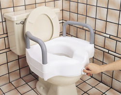 - This elevated commode seat with padded arms allows the patient to raise the height of the toilet 5 inches and the padded arms provide a comfortable hand support for stability when raising up from or lowering onto the seat. The seat is placed on the toilet bowl and firmly attached to the inside of the toilet rim by tightening a knob on the front of the seat( no tools required). Made of easy to clean polypropylene resin. Weight of 5 lbs with a weight capacity of 250lbs. Has a width of 20.5 inches and a depth of 18 inches. The opening in the seat is 8 inches by 9.5 inches. Height with arms is 11 inches.