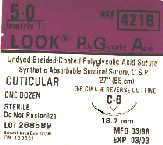 LOOK PolyGlycolic Acid Suture, Coated, Undyed Braided. Office Surgery. Reverse Cutting. Needle Type: C6. Needle Length: 18.7mm. Needle Shape: 3/8 Circle. Suture Length: 27". Suture Size: 5-0.
