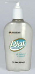 - Liquid Dial Antimicrobial Soap w/Moisturizers & Vitamin E, 7.5 oz Decor Pump, 12/cs. Fast acting antibacterial soap with Triclosan. Kills bacteria on contact, removing 97% of contamination bacteria and viruses within 30 seconds. Helps prevent growth of pathogenic bacteria even after washing. Rich viscosity and pleasant fragrance. Emollients and skin conditioners ensure mildness, even with frequent hand washings.