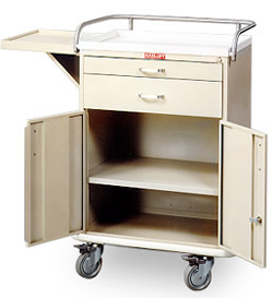 - Multi-Treatment Cart with Shelf and Rail, Beige. Assembled Dimensions 44.5"H x 22"D x 32"W. Steel construction; electrostatically powder-painted baked finish. Key locking cabinet and doors, Plastic removable top, Stainless steel combination top rail/push handle, 5" premium rubber casters, all swivel, two with brakes, Side drop shelf, Vinyl padded full wrap-around bumper, Two 3" adjustable exchange trays, Ball-bearing drawer slides with detent to prevent unlocked drawers from opening when the cart is moved. Five-year warranty against manufacturing defects. Latex-free.