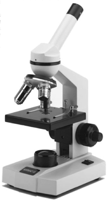 - Microscope model M100. Full size economical student microscope. Widefield 10x eyepiece, rotatable, with safety lock and built-in pointer. Monocular head or inclined 45-degrees and rotates 360-degrees. 4x/0.1, 10x/0.25, 40x/0.65, DIN achromatic objectives; parfocal, parcentered and color-coded. Triple nosepiece with click stop. Large stage, 110mm x110mm, acid and reagent resistant. Stage drilled and tapped to accept attachable graduated mechanical stage. Locked-on spring-loaded stage clips. Coaxial coarse and fine adjustment with slip clutch system to prevent gear damage. Built-in 0.65 condenser with 5-aperture disc diaphragm. Built-in bright 115V 20W tungsten bulb. UL & CSA approved three wire grounded electric cord. Plastic dust cover. Use and care manual. 5 year limited warranty.