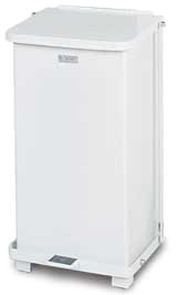 - United Receptacle Self-Extinguishing Step Cans. Constructed of fire-safe steel with a powder coated enamel finish. All models are UL listed and FM approved. Foot pedal permits "hands-free" operation of self-closing lid. Square step cans are complete with Germ-Fighter antimicrobial rigid plastic liners and steel retainer bands to hold poly bags in place. 12" Square x 23" H Step Can, Red Baked Enamel Finish, 12 Gallon, Plastic Liner.