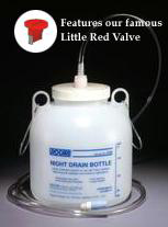 - Urinary Drainage Bottle. Large 2000 ml. Capacity. 60" of Drainage Tubing. Large Opening for Easy Cleaning. Large Finger Holes. Hooks for Hanging. The Urocare Night Drain Bottle is an effective bedside drainage system for use with Foley catheters, male external catheters, urostomy, ileostomy, suprapubic applications, etc. It has a large bottom surface area with a small corner radius so it cannot be tipped or pulled over easily and is simply transferred from one side of the bed to the other. Made of rigid, high-density polyethylene (HDPE), this bottle may be cleaned and reused many times. An easy-to-open cap with a large opening makes it easy to empty and clean.