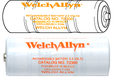 Welch Allyn rechargeable nickel-cadmium battery (color coded orange) for the 3.5 volt handle.