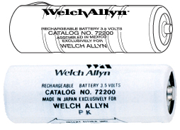 • Welch Allyn rechargeable nickel-cadmium battery (color coded black) for the Welch Allyn 3.5 volt handles (WA71000, 71010, 71015, 71020, 71050, 71051, 71054, 71055, & 71670).