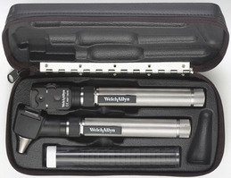 - Welch Allyn 2.5v PocketScope Set with Ophthalmoscope, Otoscope, "AA" Batteries, and Hard Case. Welch Allyn quality instruments in a pocket-size set. 2.5V Otoscope also has built in throat illuminator - two in one instrument. Features halogen illumination and fiber optics for a cool light with no reflections or obstructions, plus a rectangular viewing lens for instrumentation under magnification. 2.5V PocketScope handle has a smooth rheostat to control light intensity and features a handy pocket clip. Key Components: 2.5v PocketScope Ophthalmoscope (without Handle), 2.5v Halogen Lamp, PocketScope Otoscope (Head Only), 2.5v Halogen Lamp, Reusable Polypropylene Diagnostic Otoscope Specula (Set of Four), 2 - 2.5v PocketScope Handle (without battery), 4 - "AA" Battery, Tube Assembly with 20 Specula (4 mm ), Hard Case for PocketScope Set.
