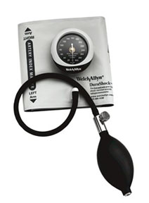 Integrated Aneroid Sphygmomanometer Gauge with Durable Two-Piece Thigh Cuff and Bladder. Includes Integrated Gauge Adapter. Gear-free DuraShock design is much more durable than traditional aneroids with gears. Features a unique, integrated, cuff-mounted design that is compact and lightweight for ease of use. Shock resistant to maintain accurate blood pressure readings with lower lifetime costs - can withstand up to 30" drop and remain in calibration. Laser-engraved dial face for accuracy. Gauge rotates 360 degrees for easy viewing and snaps directly into cuff for quick cuff change. 10-year calibration warranty. Large inflation bulb and high-quality air-release valve make inflation easy. Latex free. Exact model not pictured. Width: 9".