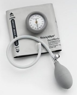 - Welch Allyn DuraShock Model DS44 Integrated Aneroid Sphygmomanometer, with durable integrated one-piece cuff, two-tone gray, child. Welch Allyn DuraShock Sphygmomanometer - the first and only gear-free, shock-resistant aneroid. By creating a gear-free design, we've created a gauge that is shock-resistant, lighter, and much thinner than traditional gauges. Until now, a dropped sphygmomanometer required recalibration or replacement. Not so for the DuraShock; it can fall 30 inches onto a hard surface and still remain accurate. Key Components: DuraShock DS44 Gauge; Integrated Durable One-Piece Cuff (two-tone gray cuff with gray tube, child); Standard Bulb (Gray, Medium); Standard Air Release Valve.