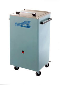 - Mobile Thermalator with 8 standard Thermal-Packs (10" x 12"). Whitehall Thermalators have the best elements of a hot therapy unit to maintain a constant water temperature for comfortable effective therapy. Recommended for use in medium sized clinics. 17 1/2" x 15 1/2" x 32 3/4". Unit is fabricated from heavy gauge, type 304, stainless steel polished to a satin finish. Cover has a continuous hinge pin and a built in stop that will keep it in the upright position when open. Interior wire rack is vinyl coated stainless steel and will hold Thermal Packs in upright position. Heating unit has a built-in adjustable thermostat to 165 degrees F. On/off switch has a built-in light to indicate that the unit is on.