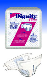 - Dignity Plus Disposable Adult Fitted Briefs. Size: Bariatric. Fits waist: 63-92". Heavy to full protection. A premium full (fluff) mat brief for complete protection for bladder and bowel containment. Higher capacity brief with zoned superabsorbent for dryness and odor control. Blue acquisition layer keeps wetness away from the skin. Tape tabs and elastic side gathers ensure a secure fit. Features a printed wetness indicator in the crotch area. Wetness indicator disappears when a change is needed.