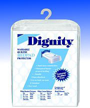 - Dignity Washable White Birdseye Quilted Bed Protector. 35 x 54" Bed Pad. Soft, quilted layer touches body. Features an absorbent core. Moisture-proof barrier. Top: 100% cotton. Middle: 100% polyester. Bottom: Polyester/PVC. 1/bag.