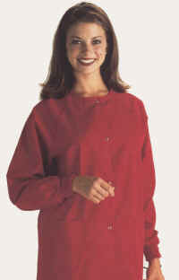 Ladies Warm-up Jacket, 28" length, Royal Blue in color, Size Medium (12/14). Color matching snaps and coordinating ribbed knit cuffs. 65% Polyester/35% Cotton with soil release.
