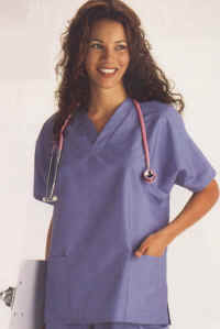 Ladies V-Neck Top with side slits, 27" length, Caribbean Blue in color, Size 3XL (26W/28W). 65% Polyester/35% Cotton with soil release.
