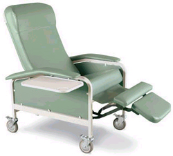 - Winco Care Cliner. Use in dialysis, blood collection, oncology, respiratory, critical care, and cardiac. 3-position recliner with infinitely adjustable back. Four heavy duty 5" casters with positive locking swivel and wheel brakes. Deep recline and Trendelenberg position can only be attained by the attendant. Standard release handle feature for quick back release. Spans entire width of back, can be operated from either side of chair. Blow molded side tables with recess for cup. Welded powder coated steel frame has a 5-year warranty.